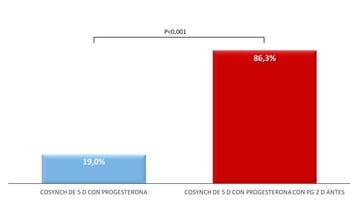 En cuanto a la tasa de ovulaciónLa expulsión de un óvulo del ovario en hembras. a la primera GnRHHormona liberadora de gonadotropina es secretada por el hipotálamo causando la liberación de FSH y LH. del protocolo, el tratamiento con PG mejoró la tasa de ovulaciónLa expulsión de un óvulo del ovario en hembras. a la primera GnRHHormona liberadora de gonadotropina es secretada por el hipotálamo causando la liberación de FSH y LH. en comparación con el grupo control (86,3% vs 19%) (P<0.001). (Figura 2).