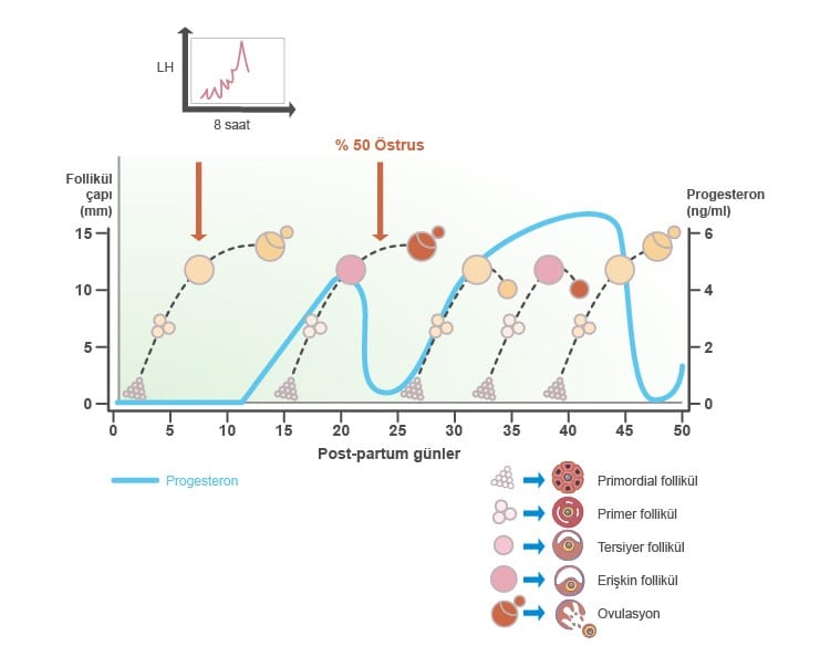 Anöstrus & suböstrus Hangi parametreler anöstrusun işletmede bir problem olup olmadığını gösterir? Bir işletmede anöstrus ve suböstrus nedenleri nelerdir? BuzağılamaBuzağı doğumu. ve 1. ST arasındaki süre İneklerin %75'inden fazlası post-partumDoğum ve siklisiteye dönüş (ve buna bağlı olarak kızgınlığın görünmesi) arasındaki periyod. 60 günden önce kızgınlıkta gözlemlenmelidir. BuzağılamaBuzağı doğumu. ve 1. ST arasındaki süre İneklerin %70'inden fazlası post-partumDoğum ve siklisiteye dönüş (ve buna bağlı olarak kızgınlığın görünmesi) arasındaki periyod. 90. güne kadar tohumlanmış olmalıdır. İneklerde belirleyici faktörleri LHLuteinize edici hormon: follikülün final maturasyonu ve ovulasyonundan sorumludur. pulslarının sıklığı ilk ovulasyonDişi hayvanlarda ovaryumdan ovumun çıkarılması durumu. zamanının belirleyici faktörüdür. İneklerde post-partumDoğum ve siklisiteye dönüş (ve buna bağlı olarak kızgınlığın görünmesi) arasındaki periyod. folliküler gelişimFSH etkisinde büyümeye devam eden 20 follikülden oluşan bir grup follikülün bulunduğu folliküler dalga aşaması. Büyüme aşaması.: Buzağılamadan sonra FSHFollikül Stimüle edici Hormon: ovaryan folliküllerin gelişiminde sorumludur. sekresyonu hızlı bir şekilde tekrar başlayarak, folliküler dalganın belirmesine ve bir dominant follikülün seçimine öncülük eder. LHLuteinize edici hormon: follikülün final maturasyonu ve ovulasyonundan sorumludur. boşalım sıklığına bağımlı bu folliküle ne olur?ProgesteronOvaryumun korpus luteumundan salgılanan steroid yapılı bir hormondur. Endometriumu implantasyona hazır hale getirir, fertil yumurtanın gelişimine devamlılığını sağlar. (Progesteron ayrıca, endometrium, myometrium, serviks, vajina ve meme üzerinde de etkilere sahiptir.) Hipofize geri bildirim etkisi ile GnRH sekresyonunu inhibe eder. yokluğunda, LHLuteinize edici hormon: follikülün final maturasyonu ve ovulasyonundan sorumludur. pulslarının sıklığı hayvanın beslenmesi, vücut kondisyonu ve buzağısını emzirmesi ile regüle edilir.İlk ovulasyonDişi hayvanlarda ovaryumdan ovumun çıkarılması durumu., buzağılamadan 10. ve 20. günler arasında gerçekleşir.Yalnızca üç vakanın birinde bu ovulasyonDişi hayvanlarda ovaryumdan ovumun çıkarılması durumu. gözle görülür bir kızgınlıkla beraberdir. Yalnızca ilk bir ya da iki siklustan sonra östrusAyrıca kızgınlık olarak da bilinir. Dişi memeli hayvanlarda, fizyolojik ve davranışsal değişikliklerin ardından ovulasyonun şekillendiği fenomen. arasındaki aralık düzenli olmaya başlar. Buzağılamada vücut kondüsyon skoru iyi olan inekler: yüksek sıklıkta LHLuteinize edici hormon: follikülün final maturasyonu ve ovulasyonundan sorumludur. pulsları ve ovulasyonDişi hayvanlarda ovaryumdan ovumun çıkarılması durumu.. Vakaların %80'inde ilk dominant follikülSekteruar ya da ekskretuar küçük boşluk. Ovaryan folliküllerin gelişimi, ovulasyon ya da dişi gamet emisyonuna kadar devam eder. ovule olur(ITEB-EDE-INRA'ya göre, 1984). Buzağılamada vücut kondisyon skoru kötü olan inekler: düşük sıklıkta LHLuteinize edici hormon: follikülün final maturasyonu ve ovulasyonundan sorumludur. pulsları ve ilk follikülSekteruar ya da ekskretuar küçük boşluk. Ovaryan folliküllerin gelişimi, ovulasyon ya da dişi gamet emisyonuna kadar devam eder. atreziye olur ve ikinci bir dominant follikülSekteruar ya da ekskretuar küçük boşluk. Ovaryan folliküllerin gelişimi, ovulasyon ya da dişi gamet emisyonuna kadar devam eder. gelişir. Bu, kistik olabilir. Vakaların yalnızca %20'sinde ilk dominant follikülSekteruar ya da ekskretuar küçük boşluk. Ovaryan folliküllerin gelişimi, ovulasyon ya da dişi gamet emisyonuna kadar devam eder. ovule olur (ITEB-EDE-INRA'ya göre, 1984). Etçi tip ineklerde belirleyici faktörler BuzağılamaBuzağı doğumu. ve ilk kızgınlıkAyrıca "östrus" olarak da bilinir. Dişi memeli hayvanlarda, fizyolojik ve davranışsal değişikliklerin ardından ovulasyonun şekillendiği fenomen. arasındaki aralık, etçi tipi ırklarda sütçü ırklardan daha uzundur. Sütçü ve etçi tip ırklarda, folliküler gelişimFSH etkisinde büyümeye devam eden 20 follikülden oluşan bir grup follikülün bulunduğu folliküler dalga aşaması. Büyüme aşaması. ve ilk dominant follikülün şekillenmesi: FSHFollikül Stimüle edici Hormon: ovaryan folliküllerin gelişiminde sorumludur. sekresyonu ve folliküler gelişimin yeniden başlaması ayrıca ilk dominant follikülün şekillenme süresi, sütçü ve etçi tip ırklarda aynıdır.Bununla birlikte, dominant follikülSekteruar ya da ekskretuar küçük boşluk. Ovaryan folliküllerin gelişimi, ovulasyon ya da dişi gamet emisyonuna kadar devam eder. farklı olursa ne olur; etçi tip ırkların yalnızca %25-30'unda ilk dominant follikülSekteruar ya da ekskretuar küçük boşluk. Ovaryan folliküllerin gelişimi, ovulasyon ya da dişi gamet emisyonuna kadar devam eder. ovule olur.Aslında, buzağıyı emzirmenin stimülasyonu, bazen zayıf vücut kondüsyonu, LHLuteinize edici hormon: follikülün final maturasyonu ve ovulasyonundan sorumludur. Boşalım sıklığında bir düşüşe öncülük eder. Bu nedenle, et tipi sığırlar, ovulasyonlarından önce 1 ve 12 arasında dominant folliküle sahip olabilirler. Önceki Sonraki